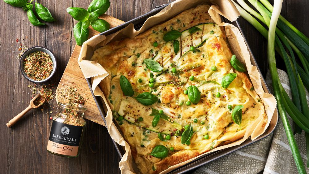 Unser Pfannkuchen aus dem Backofen ist ein herzhafter Allrounder – luftig gebacken mit Zucchini, Erbsen, Frühlingszwiebeln und Mozzarella, verfeinert mit Ankerkraut Rührei scharf für das gewisse Etwas. Einfach aufs Blech gießen, backen und genießen! 🥒🍳🧀