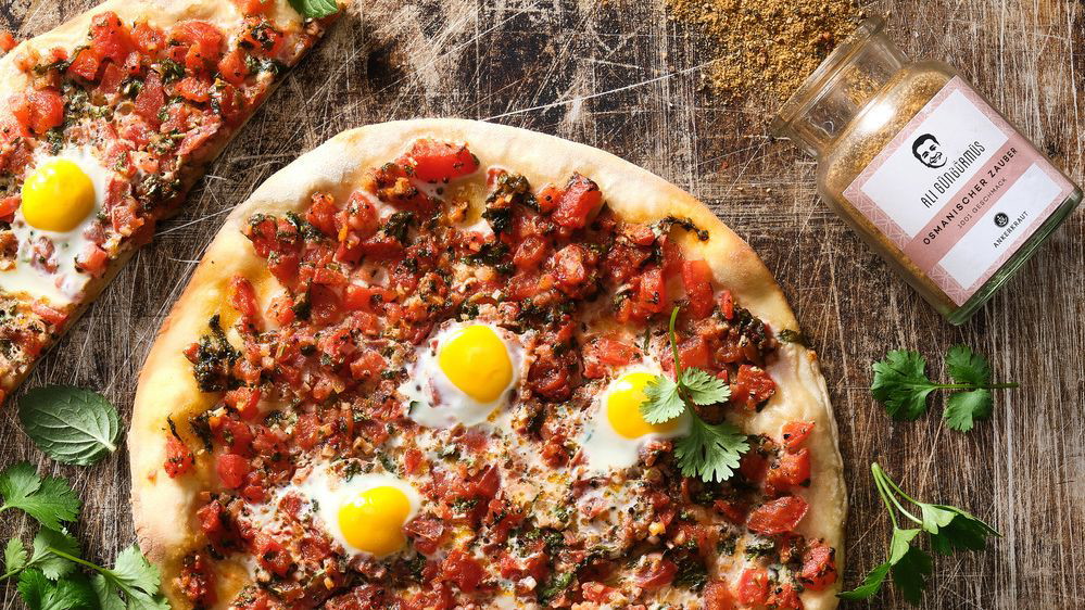 - Eine Portion Teig auf die bemehlte Arbeitsfläche legen, mit Mehl bestäuben und mit einer Teigrolle 4 mm dünn zu einem runden Fladen ausrollen. Das Topping in 4 Portionen teilen. 1 Portion auf dem Fladen verteilen. 4 Wachteleier aufschlagen und vorsichtig auf den Belag geben. Den Lahmacun mit Hilfe eines Pizzaschiebers auf den heißen Pizzastein legen und 5 – 7 Minuten im vorgeheizten Backofen backen.