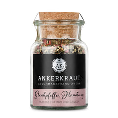 Ankerkraut Steakpfeffer scharf im Korkenglas auf weißem Hintergrund.