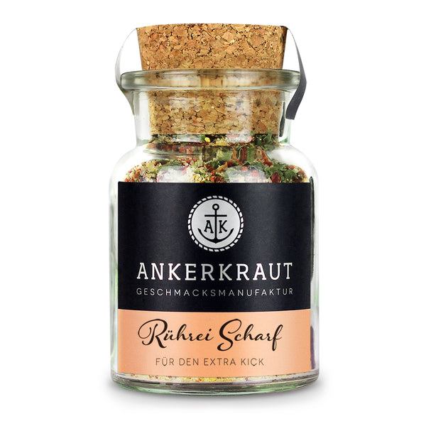 Ankerkraut Rührei Gewürz Scharf im Korkenglas auf weißem Hintergrund.