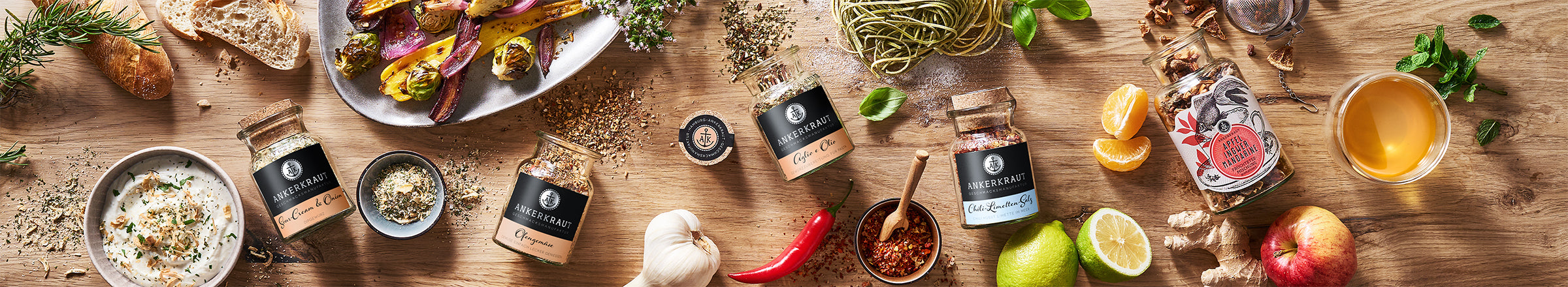 Aglio E Olio Gewürz von Ankerkraut im Korkenglas auf weißem Hintergrund.