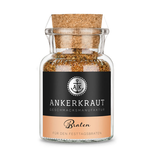 Winterzeit ist Bratenzeit. Und genau dafür haben wir einen Braten-Alleskönner für dich: Egal, ob für Kaninchen-, Rinder-, Schweine- oder Hackbraten. Unser Bratengewürz setzt sich aus Meersalz, Zwiebel, Knoblauch, schwarzem Pfeffer, Thymian, Paprika und Lorbeerblatt zusammen. Durch geräucherte Paprika, Jalapeño und Zimt erhält dieses Weihnachtsgewürz seine intensive Note. Deine Geschmacksnerven werden begeistert sein! Auch die Bratensoße lässt sich damit sehr gut abschmecken.