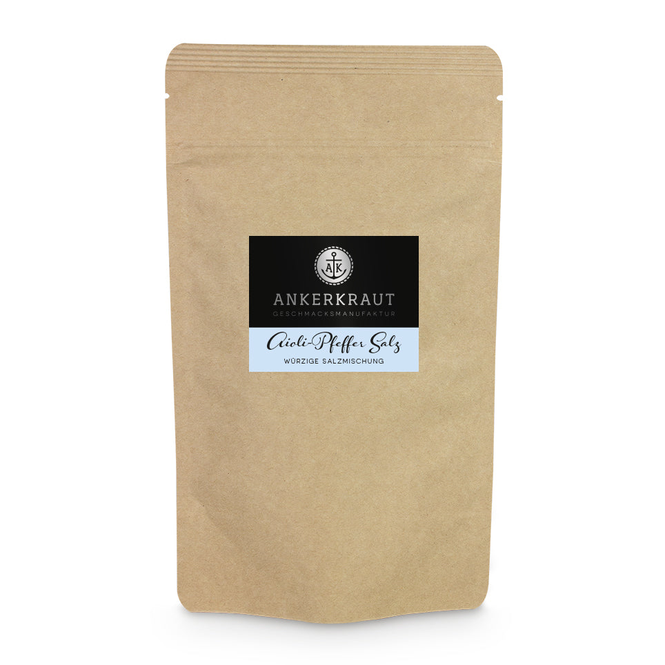 Unser Aioli-Pfeffer Salz ist eine schmackhafte Gewürzmischung und enthält nur die Zutaten, die schon im Namen genannt werden: Salz, Knoblauch und weißen Pfeffer. Die Aioli-Gewürzmischung ist wie geschaffen für alle Puristen, die nicht viel brauchen, um glücklich zu sein. Dabei haben wir vor allem das Salz und den Pfeffer ganz bewusst gewählt.