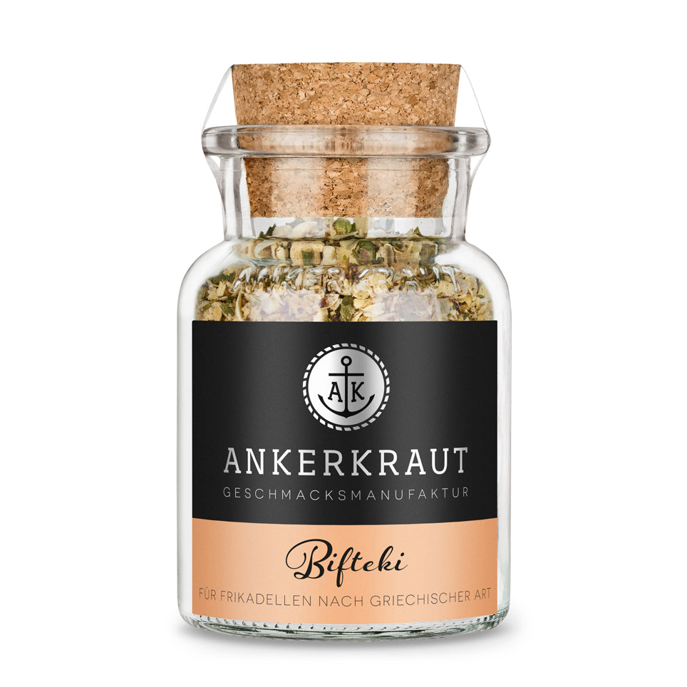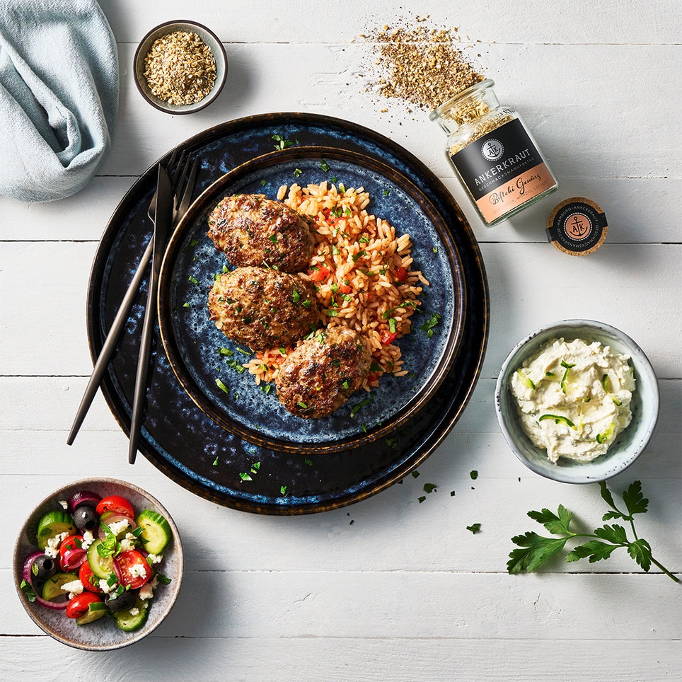 Mit der Ankerkraut Gewürzmischung gelingen dir die Bifteki ganz leicht! Ausgewählte Zutaten sorgen für den typisch griechischen Geschmack auf deinem Teller: Zwiebel, Meersalz, Knoblauch, Petersilie und Kokosblütenzucker sind nur einige der aromatischen Bestandteile der würzenden Mischung im Glas. Einfach mit dem Hack vermischen, je nach Belieben Schafskäse hinzufügen und frisch genießen. Du kannst dein Bifteki grillen, in einer Auflaufform garen oder eben in der Pfanne brutzeln.