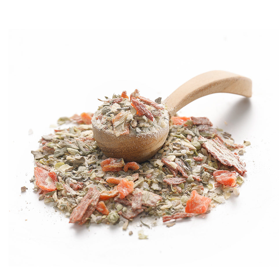 Meersalz, getrocknete Karotte*, Tomatenchips (Tomate, Maisstärke)*, Sellerie*, Rohrohrzucker*, Zwiebel*, Rosmarin*, schwarzer Pfeffer*, Oregano*, Basilikum*, Thymian*, Knoblauch*, Salbei*, Lorbeerblätter*, Zitronenschale*