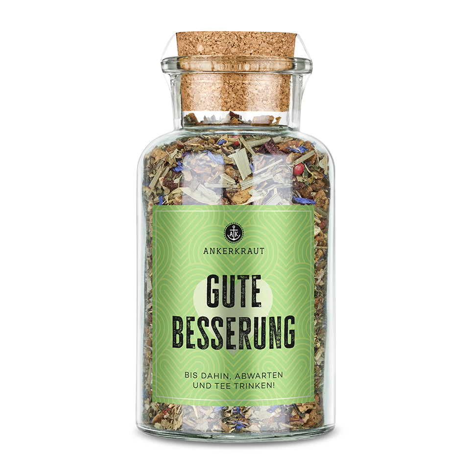 Hier gibt’s Gute Besserung im Glas. Also... es ist Tee im Glas. Aber gute Wünsche bleiben guten Wünsche!
