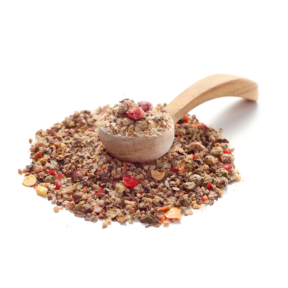 Einfach bei beiden Varianten darüberstreuen und genießen: Die fein abgestimmte Mischung aus schwarzem, grünem, weißem Pfeffer, Rosa Beeren, Meersalz, Zwiebel, Knoblauch, Muskatnuss, Chilischrot und einem Hauch Rohrzucker bringt den letzten Schliff in dein Pfännchen. Davon profitiert jeder Inhalt, der zum Käse passt. Du entscheidest dabei, wie intensiv du würzen willst.